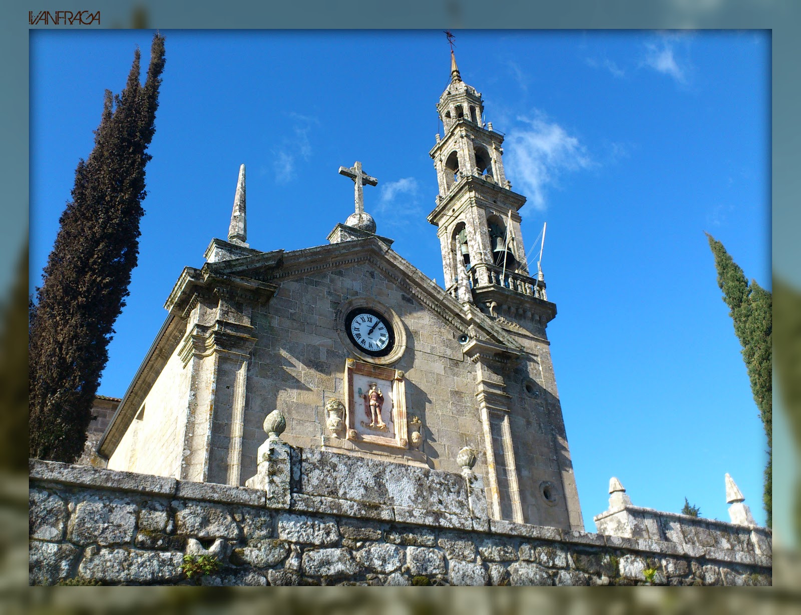 Os nosos pasos condúcennos pola contorna da igrexa, onde descubrimos o seu amplo e axeitado adro. Ó longo dos anos fóronse instalando pequenas e máxicas fontes esculpidas na rocha. Tamén ollamos portentosas balconadas barrocas, cruceiros, e mesmo outra pequena capela que se agocha tralo santuario principal. Trátase da hermida do Carme, tamén barroca, e tamén co seu particular campanario. Os gustos de épocas pasadas remataron por introducir os espléndidos e vistosos exemplares de flora exótica. No medio destes bastos vales, as palmas e as camelias aportan unha nota de cor e de señorío.
